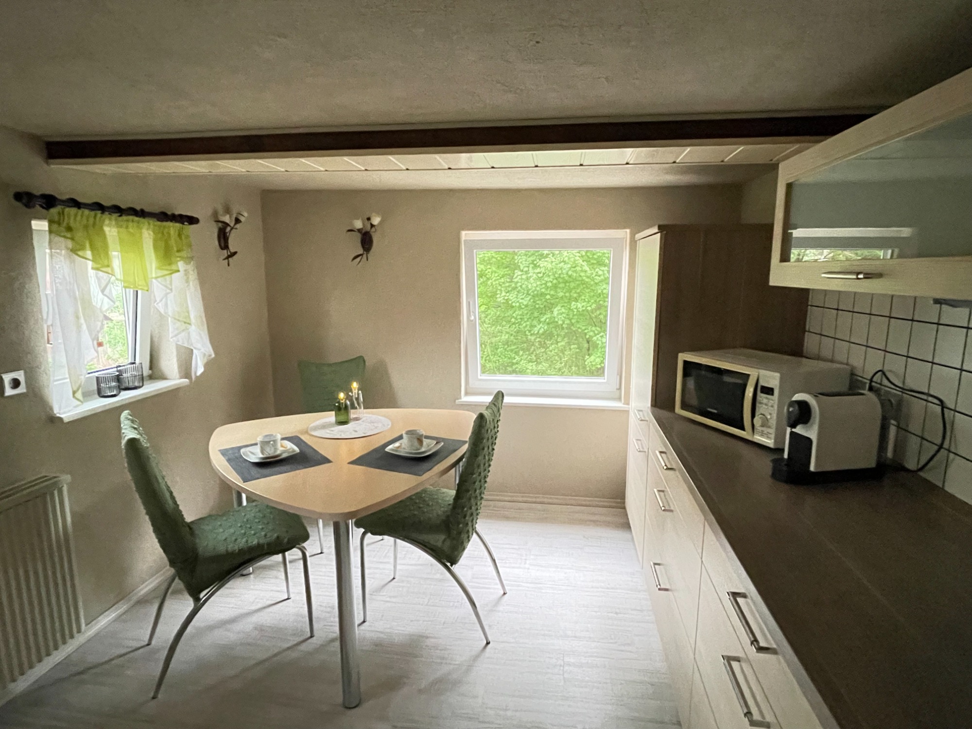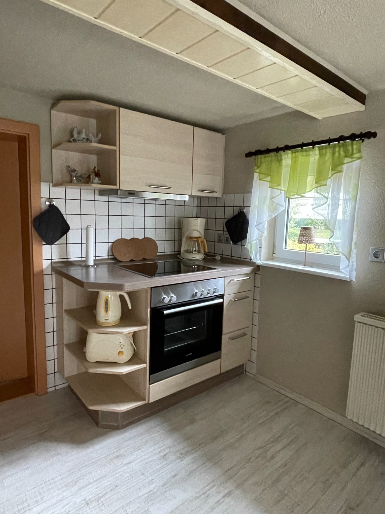 - komplett eingerichtete Küche mit Cerankochfeld, Backofen, Mikrowelle, Kapselmaschine, Kaffeefiltermaschine, Wasserkocher, Toaster