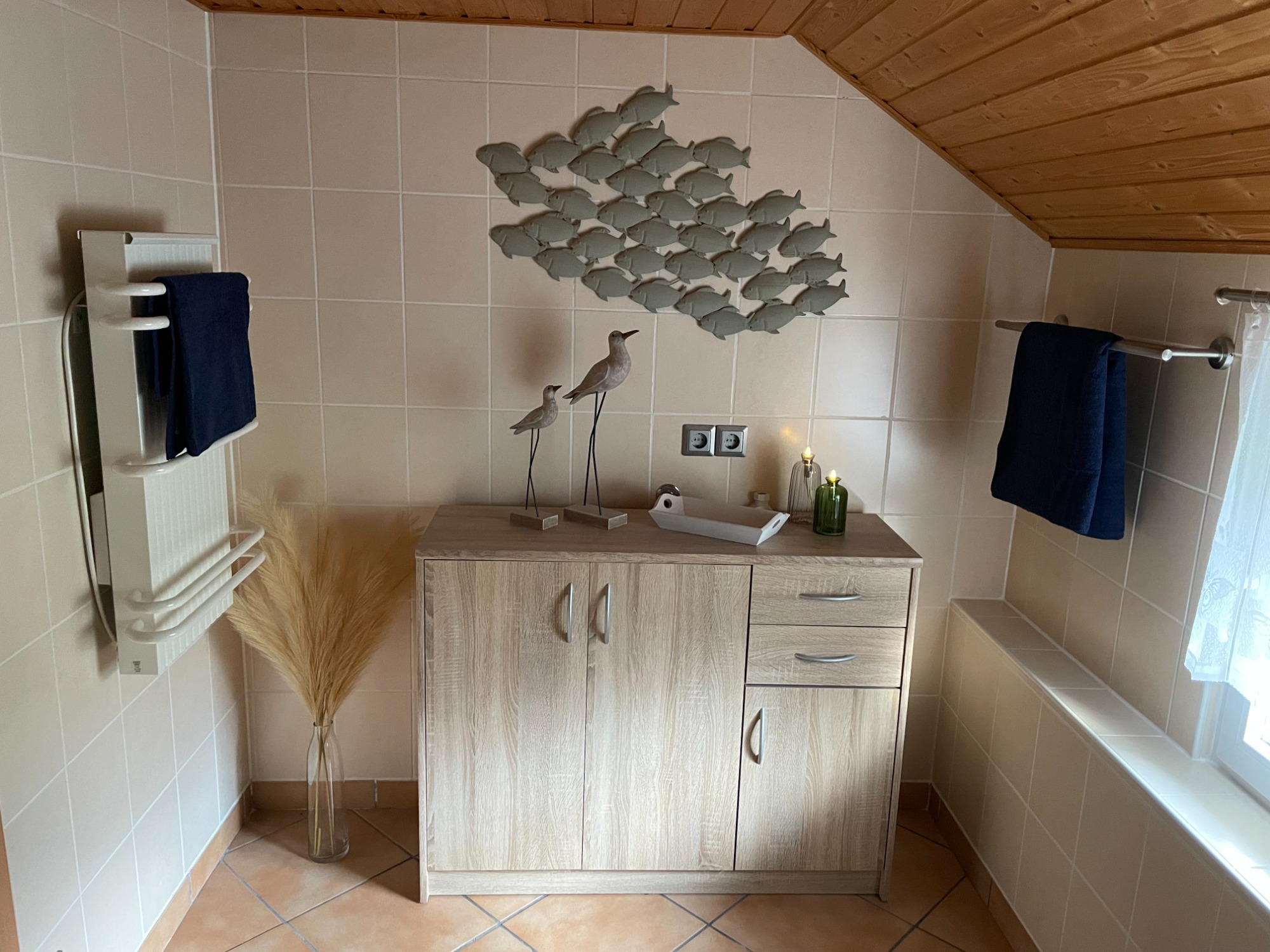 Unser Badezimmer sorgt für Erholung und Entspannung. Hier könnt Ihr den Stress des Alltags hinter euch lassen. Handtücher und Badetücher liegen für Euch bereit.